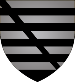Fascé (aliàs : burelé) d’argent et de sable, au bâton de sable brochant à dextre.